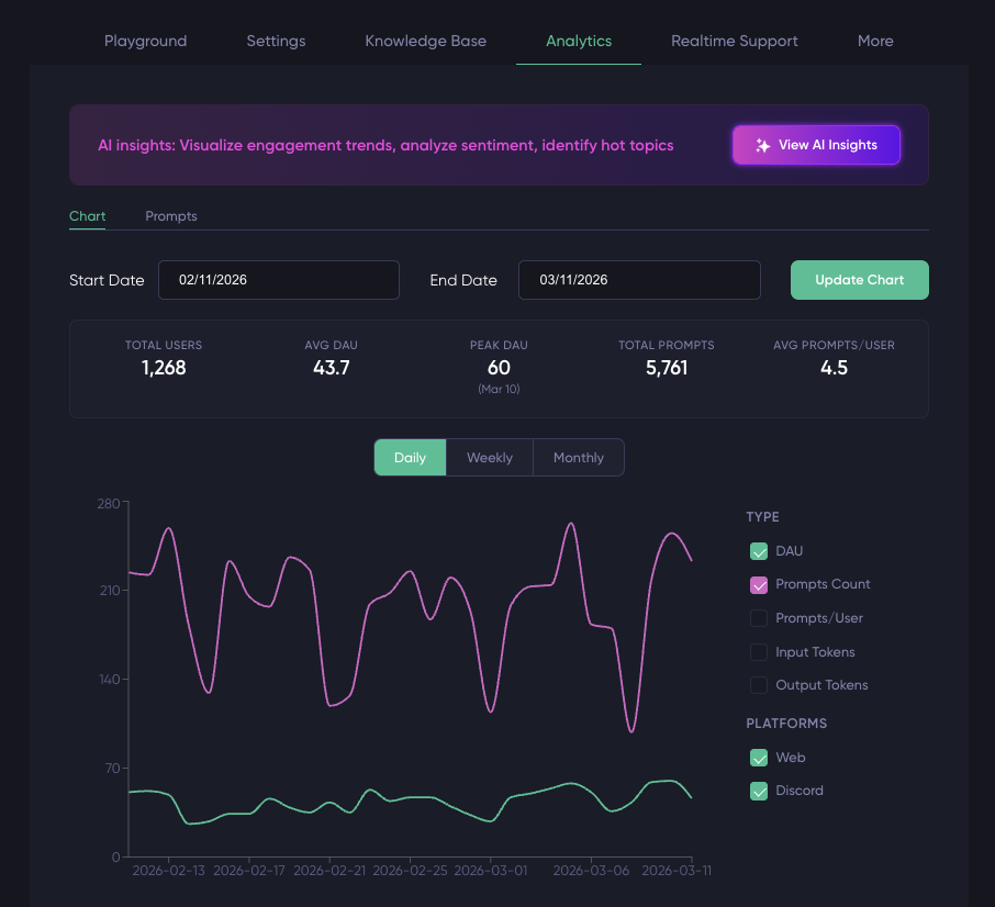 - A breakdown of positive, neutral, and negative prompts, with a visual sentiment chart, so you can quickly see if conversations are mostly constructive or frustrated.