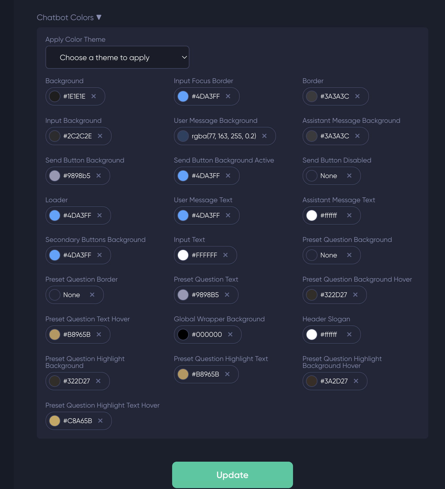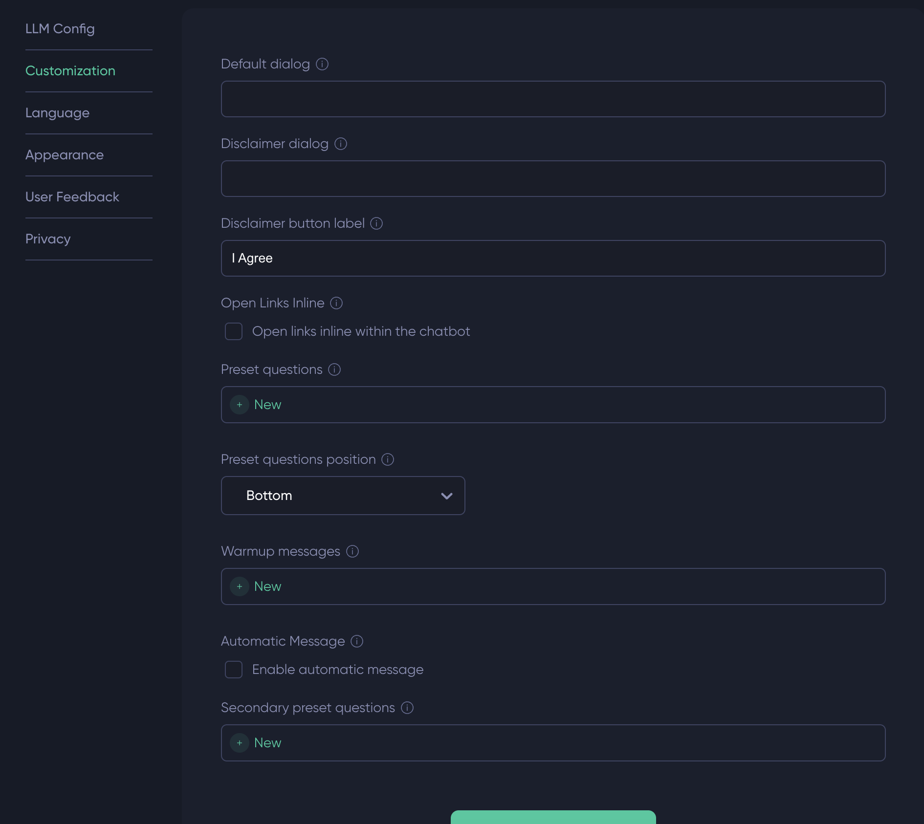 We offer a range of customization options on the "Settings" tab to help you tailor your chatbot, including:
