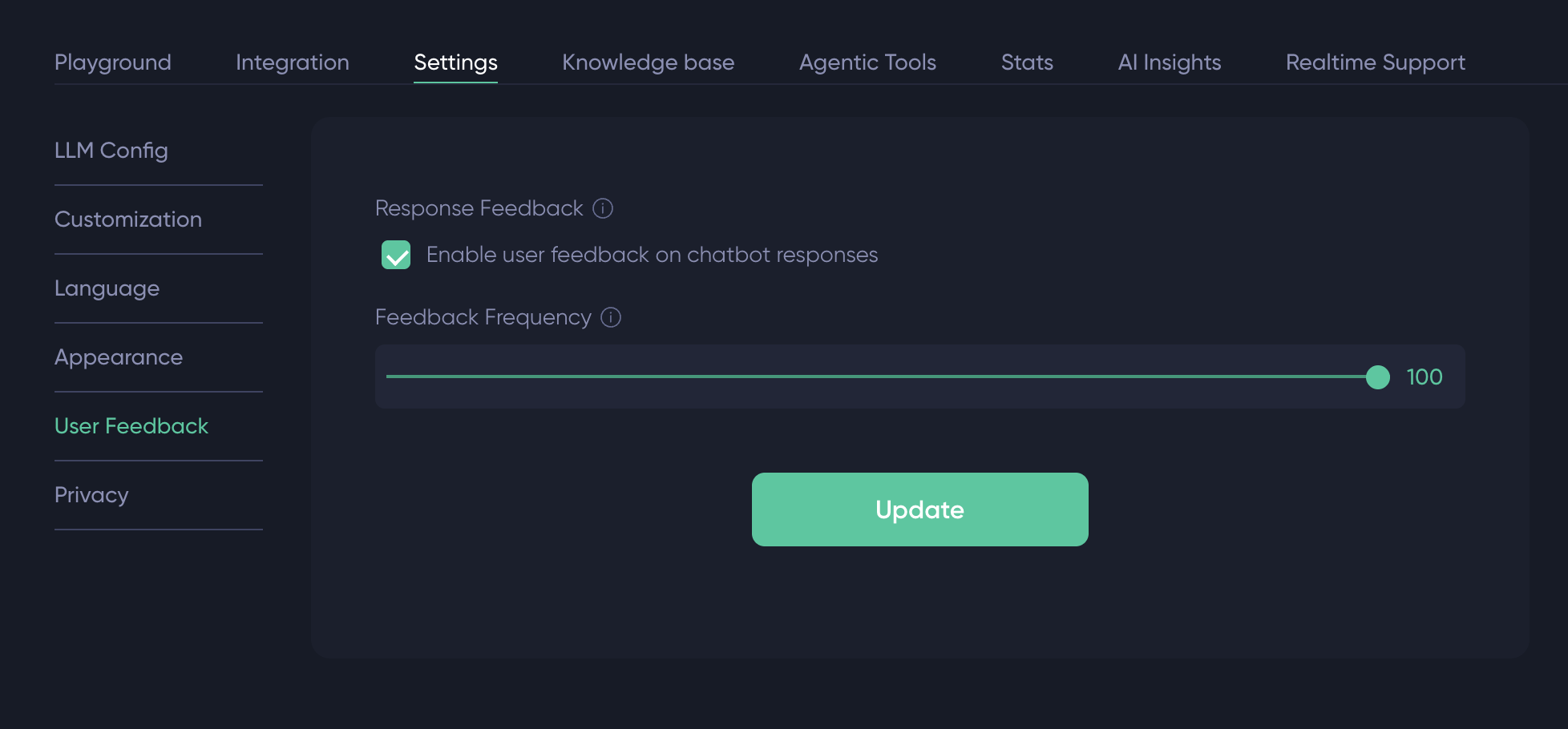 You can enable user feedbacks. It will display thumbs options to the user to give a quick appreciation of any answer provided by the AI Agent. You can display the user feedbacks UI on all the messages or just a percentage of them.