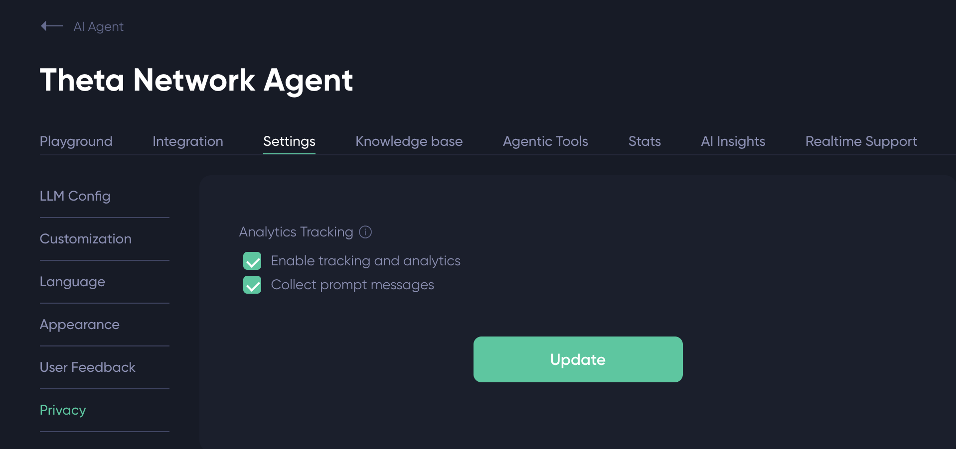 You can decide if you want to enable tracking and analytics. You can also disable prompt content. All the data collected will be available in the Stats tab and you can also use our AI Insights tool to get a picture of the discussed topic and user sentiment in just a few minutes.