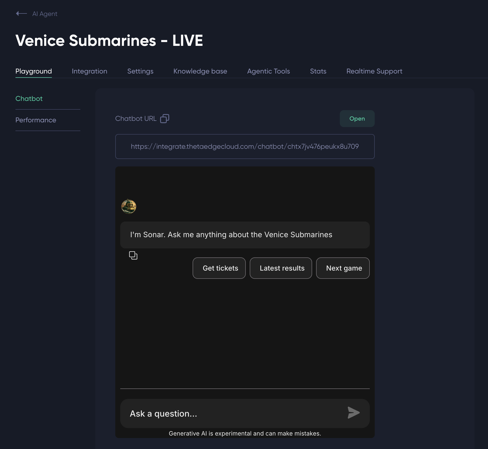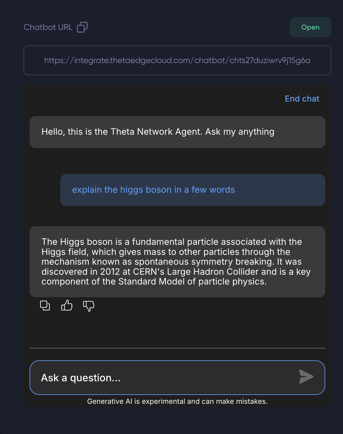You can change the LLM endpoint for the chatbot any time. We provide standard endpoints such as Llama 3.1 70B Instruct and Llama 3 8B Instruct, both hosted by Theta EdgeCloud. Third party LLMs such as GPT-4o, GPT-5.2, Gemini 2.5 Pro, and Claude Sonnet 4.5 are also supported.