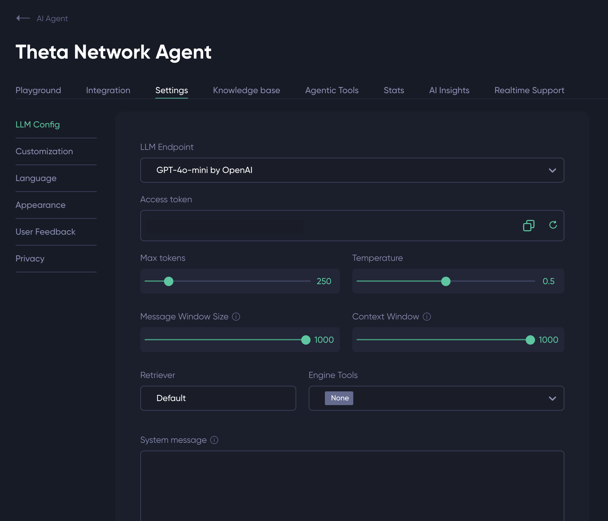 You can change LLM parameters such as max tokens, temperature, and system message. Please refer to this article for the meanings of these parameters. In the example below, we set the max token and temperature of our chatbot to 2000, and 0.2, respectively. And the system message (aka. system prompt) is set to the following paragraph: