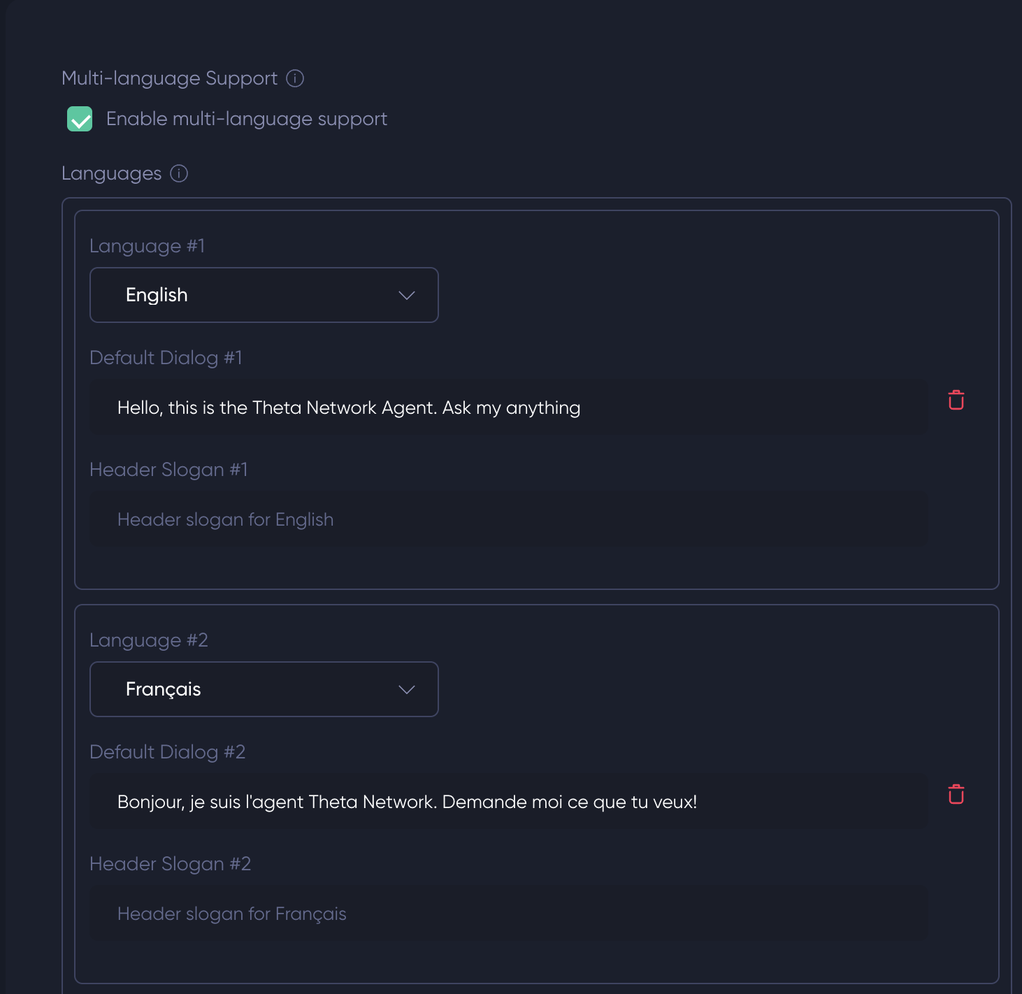 We've added support for multi languages. When enabled, you'll need to specify a default dialog for each language.