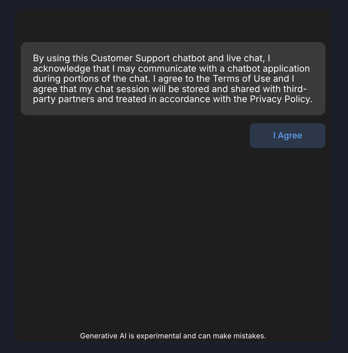 If you want to display a disclaimer message to your users, you can fill this option and it will be displayed every time a user opens the agent. Users won't be able to talk to the agent until they agree to the disclaimer.