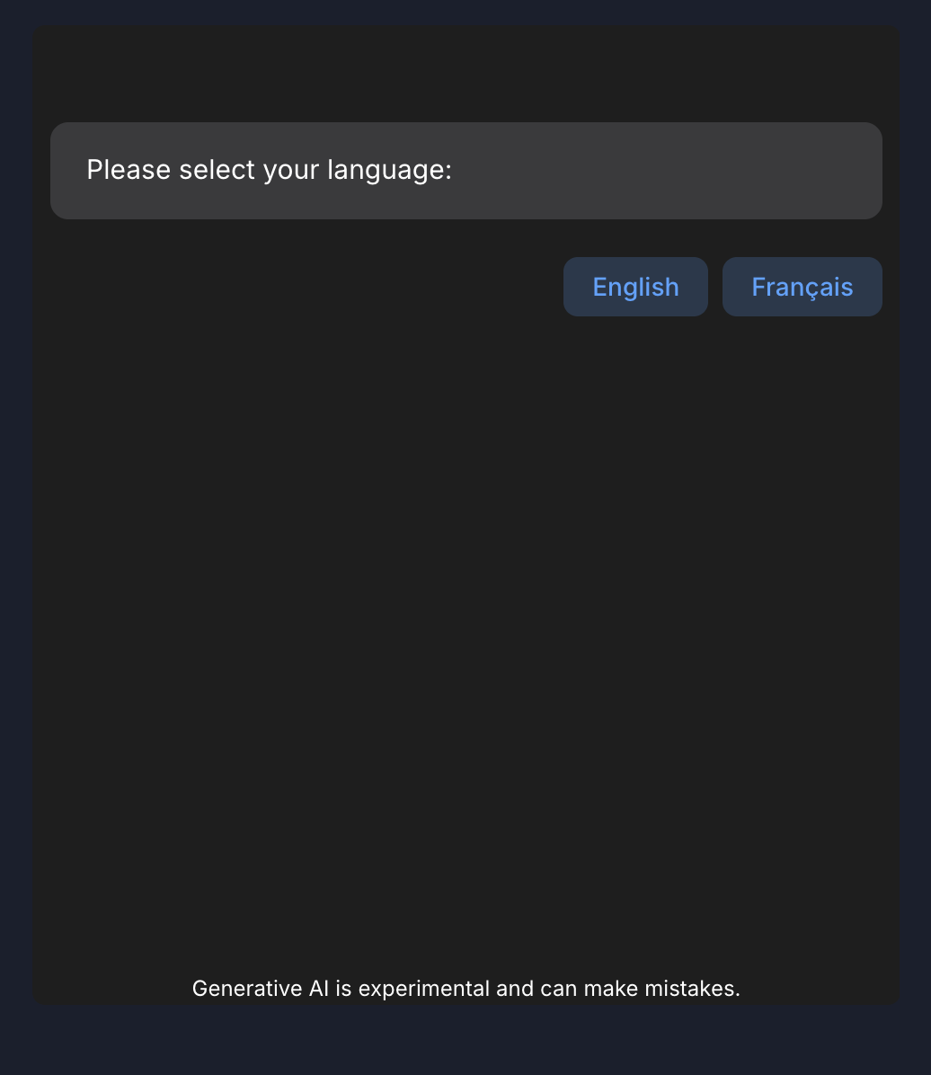 You can set the "Default Dialog", i.e. the welcome message which will display by default when the chat is opened. Below is what we use for our example: