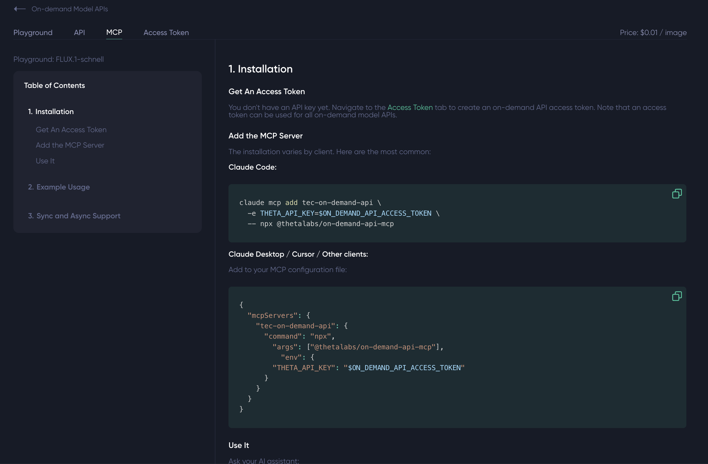 Coming back to the third tab, we provide instructions for adding the MCP server of the on-demand model API to coding agents such as Claude Code, Cursor, and Windsurf. This allows users to generate images, transcribe audio, and run LLM inference directly from their AI assistant using natural language.