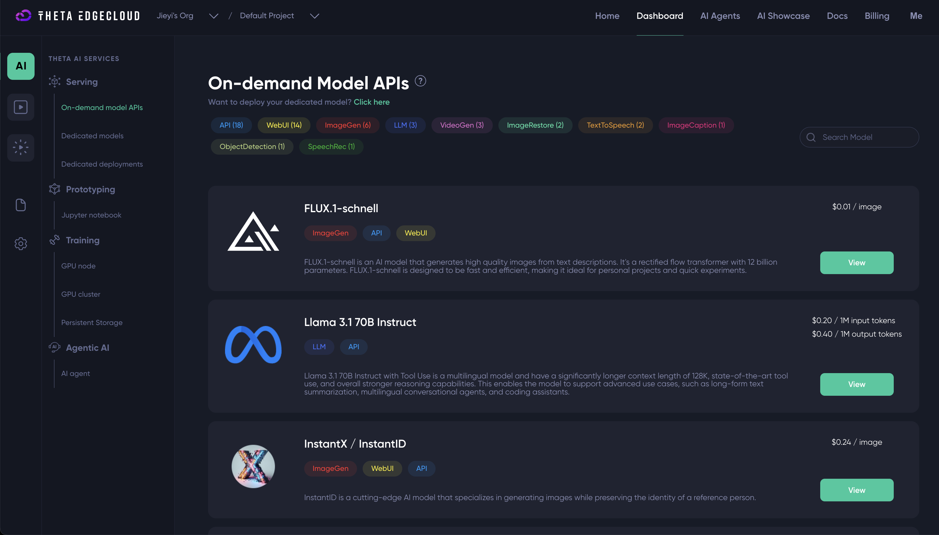 Our new On-demand AI Model Inference API Service enables serverless development for building and scaling intelligent applications. With this feature, you can now access powerful AI models — ranging from cutting-edge LLMs to GenAI models — instantly via a simple API, without the hassle of provisioning or managing servers. Whether you're prototyping a smart assistant or deploying a production-grade AI solution, our pay-as-you-go model ensures you only pay for what you use, while the Theta EdgeCloud platform handles the rest. It's the fastest way to bring AI into your apps — no infrastructure, no overhead, just plain simple API integration.