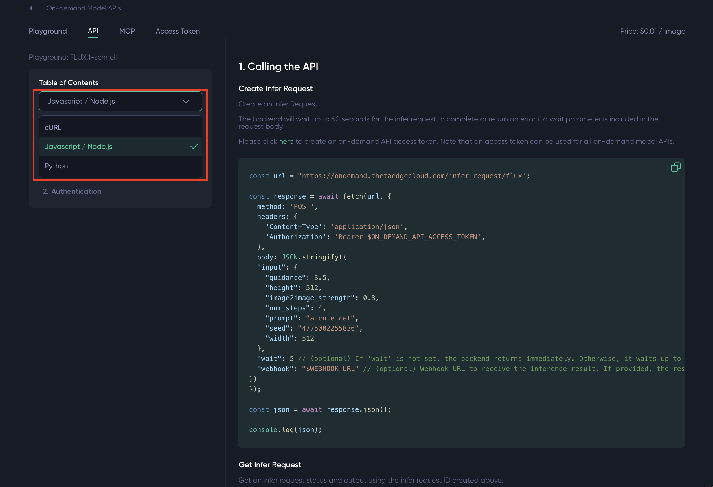 The second tab is particularly useful for developers, as it provides detailed API documentation for the currently selected model. It includes API specifications and example code snippets in multiple languages, such as cURL, JavaScript / Node.js, and Python. You can select your preferred language from the dropdown menu highlighted in the red box.