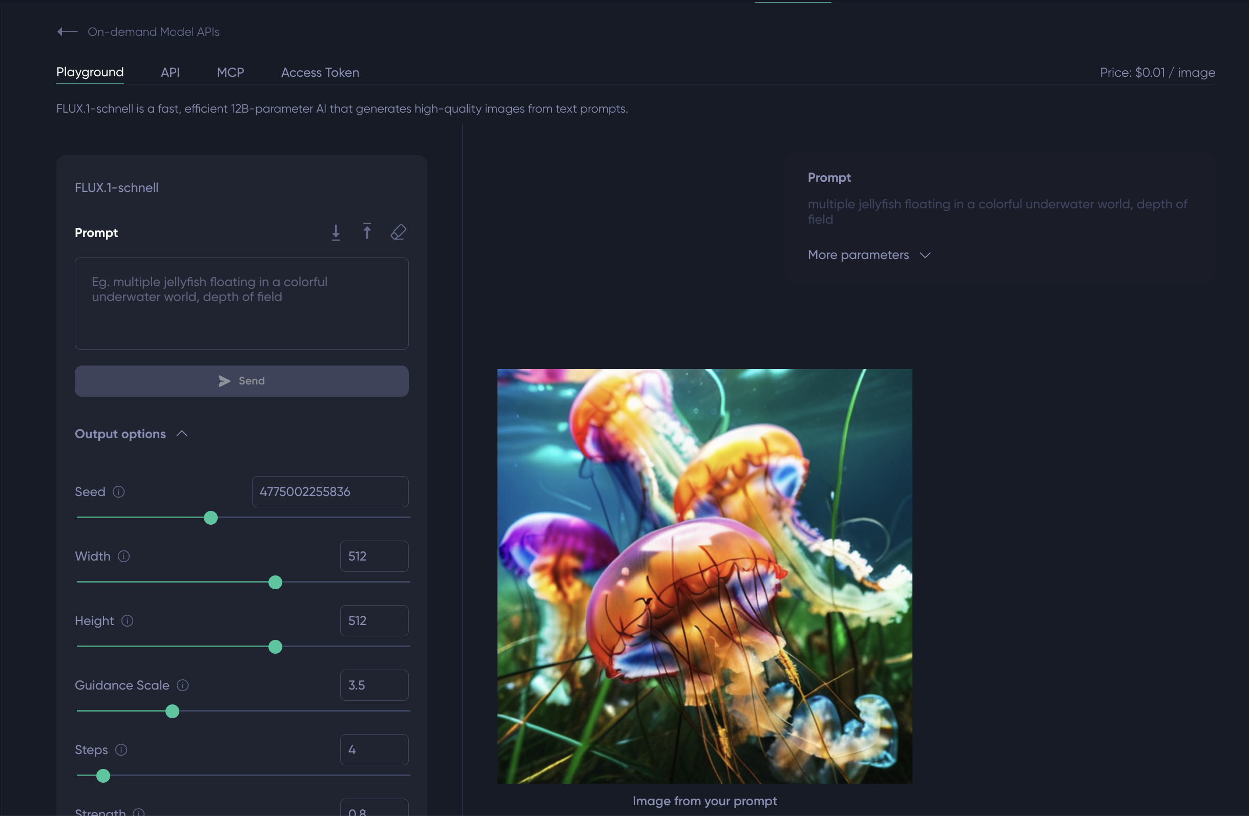 Using FLUX.1-schnell as an example, after clicking the “View” button, you’ll be taken to a page with four tabs. The first tab, "Playground", allows you to interact with the model directly through the UI. For instance, the Playground for FLUX.1-schnell accepts a text prompt along with generation parameters such as image resolution, and generates an image based on your input when you click the "Send" button.