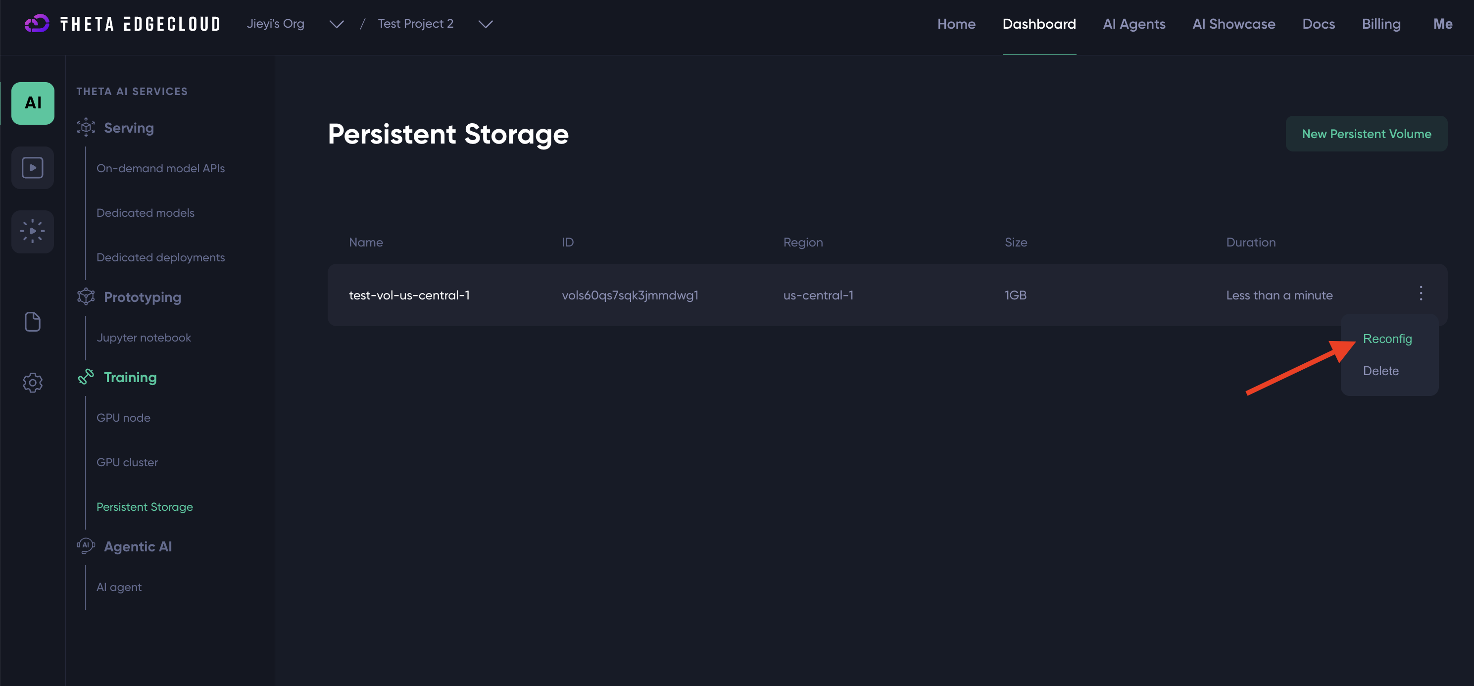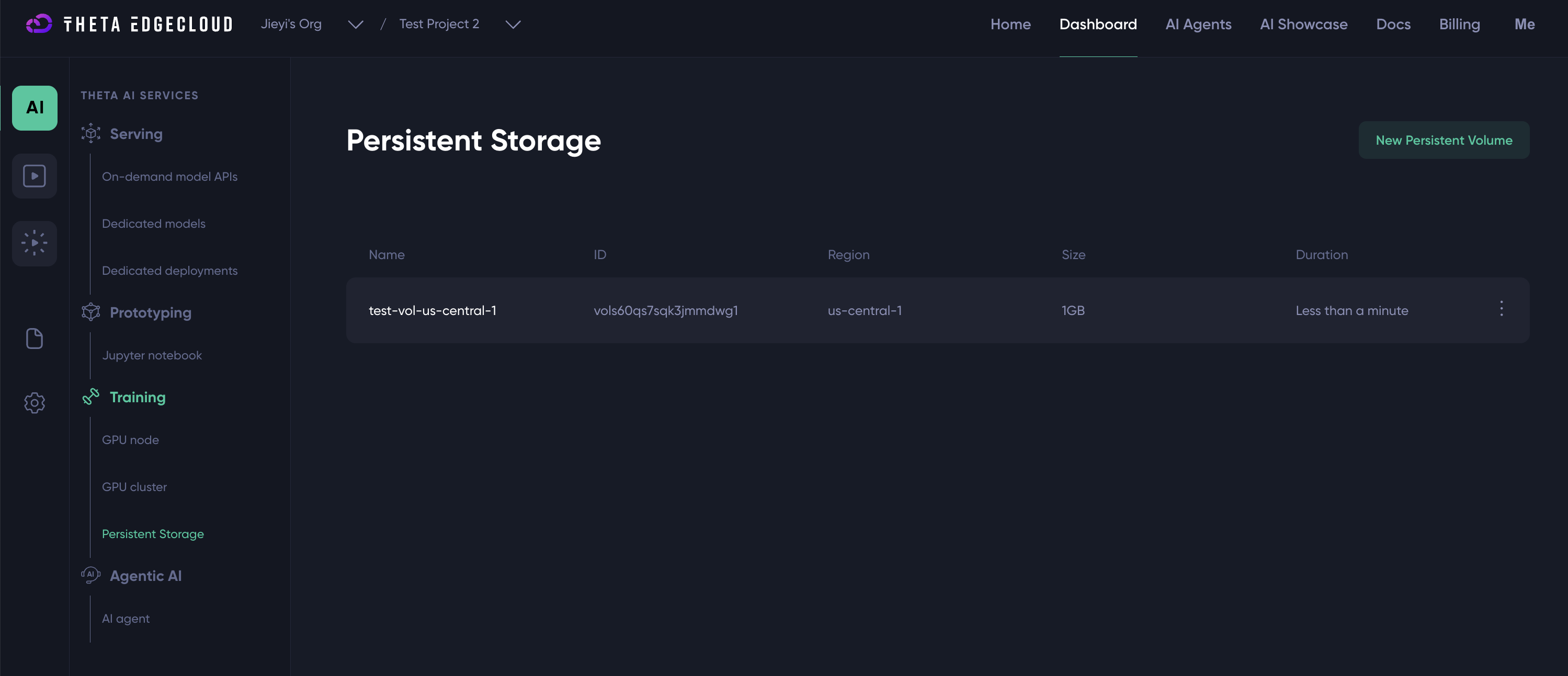 Theta EdgeCloud allows users to create persistent volumes on demand and attach them to the GPU nodes as needed. Unlike ephemeral storage, a persistent volume can retain its data even after the associated GPU node is stopped or deleted.