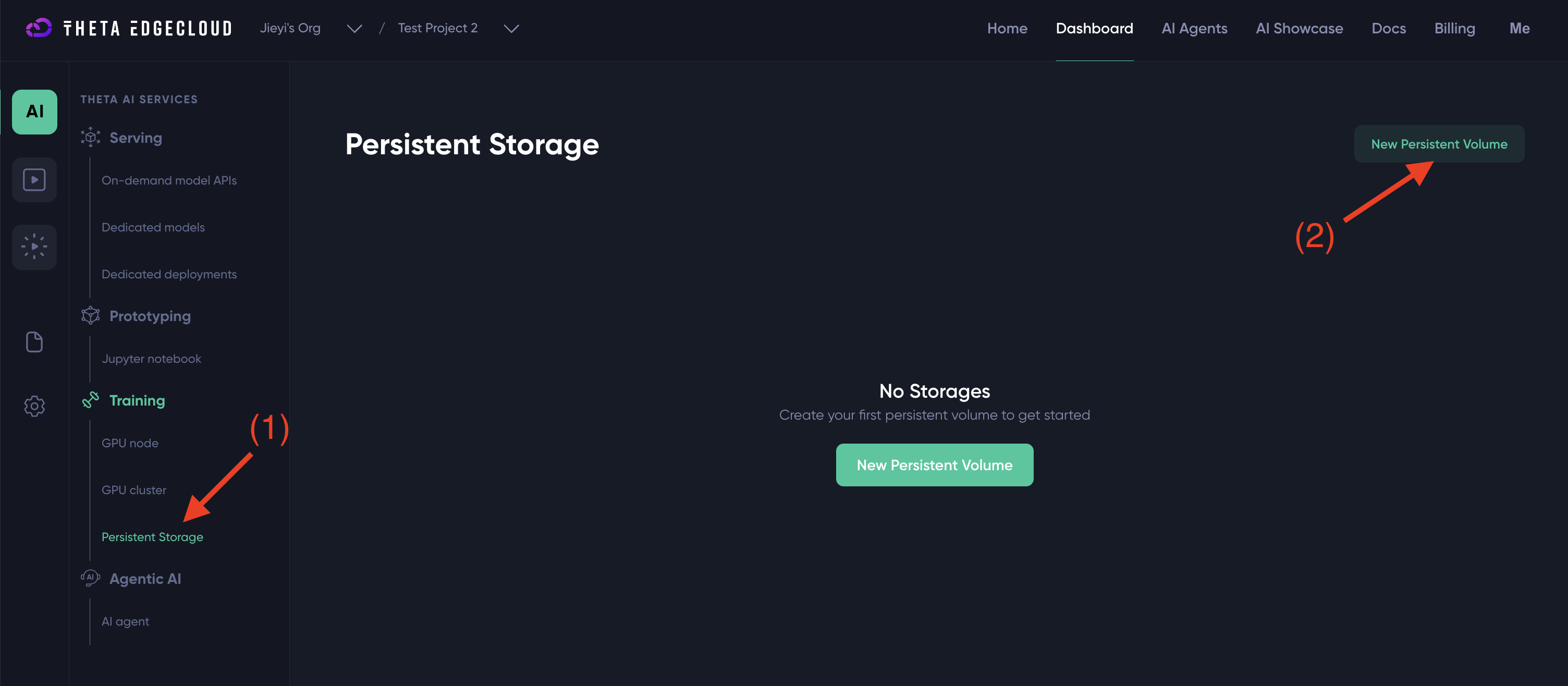 First navigate to the "Persistent Storage" page under the "Training" category, which can be assessed by simply clicking on the "AI" icon on the left bar, and then click on the "Persistent Storage" tab.