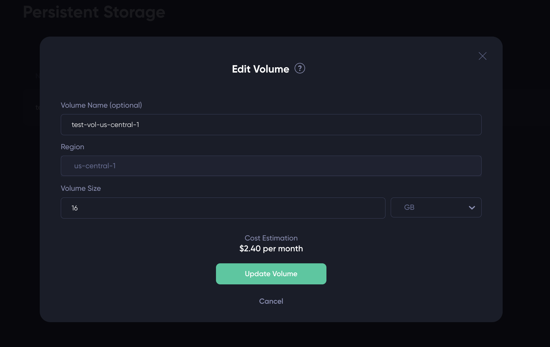 Volume Name(Optional): You can specify a name for the persistent volume in the "Volume Name" field. You can also leave it blank and update the name later after the volume is created.Region: Please select the region where you want to create the persistent volume from the dropdown menu. Note that a volume can only be attached to a GPU node created in the same region.Volume Size: Specify the size of the volume. The unit is "GB" by default. You can change it to "TB" through the dropdown menu on the right. Once you enter the size, the UI will display the monthly cost estimation to you.