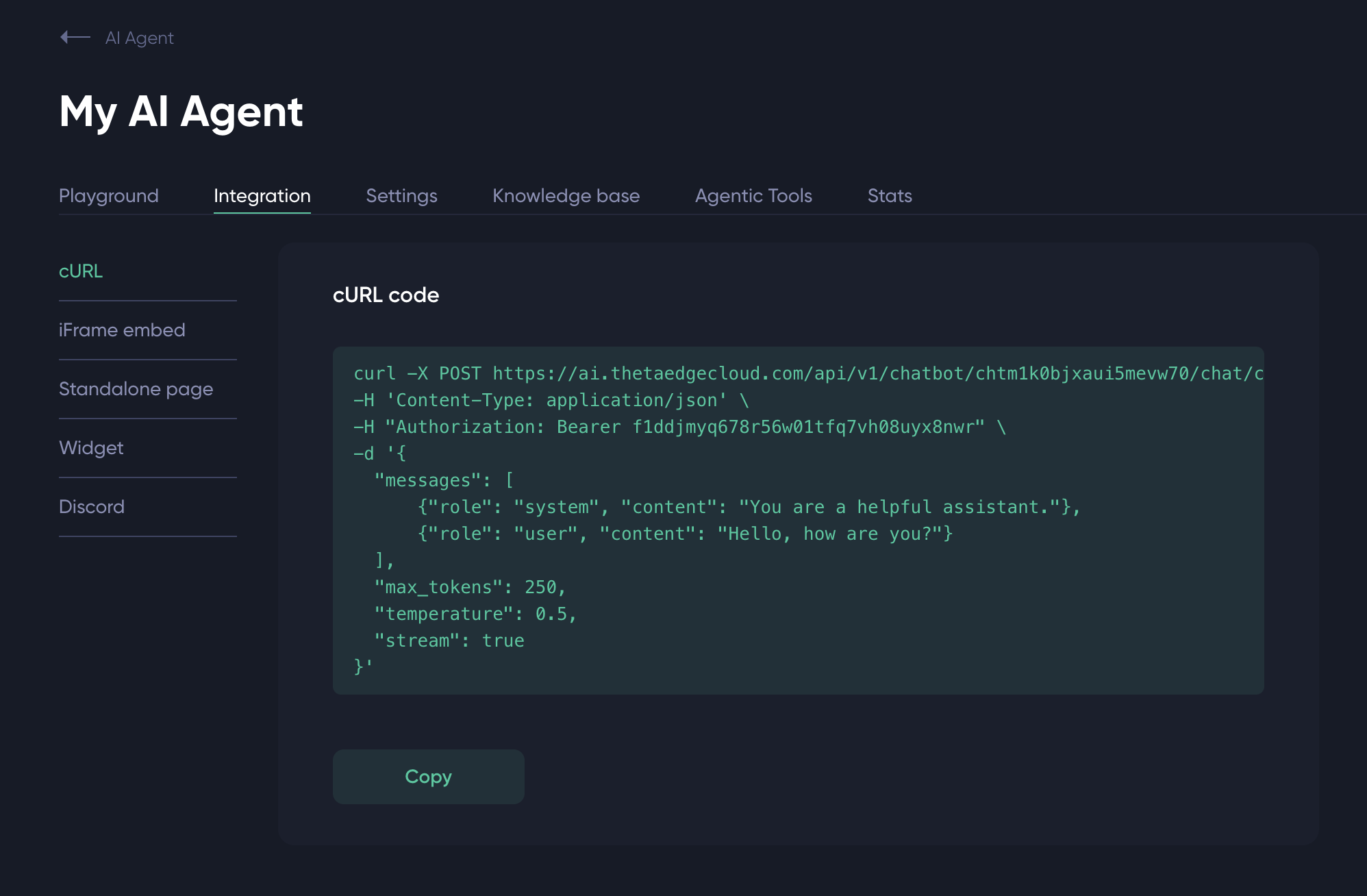 You can see the cURL code for your chatbot under the "Integration / cURL" tab. The agent API is compatible with the OpenAI chat completions API.