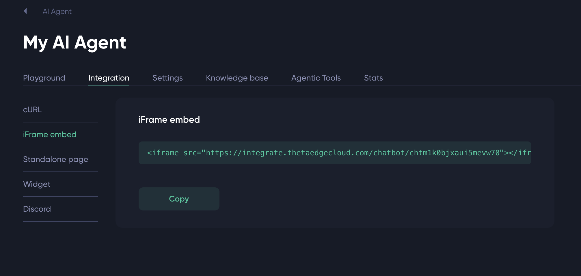 We also support iFrame integration which allows you to add the chatbot to your web app with just one line of code. Just navigate to the "Integration / iFrame" tab to copy the iFrame code.