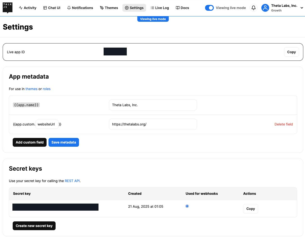 In the TalkJS dashboard, navigate to the Settings tab to copy and paste the App ID and Secret Key to the Realtime Support tab in the TEC dashboard.