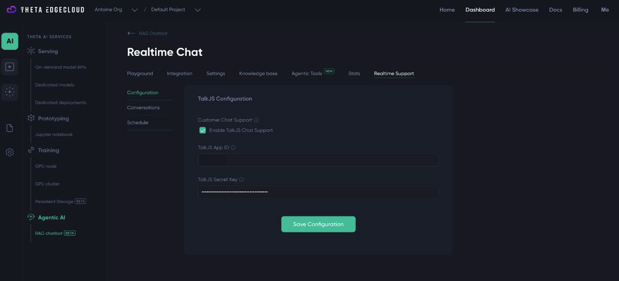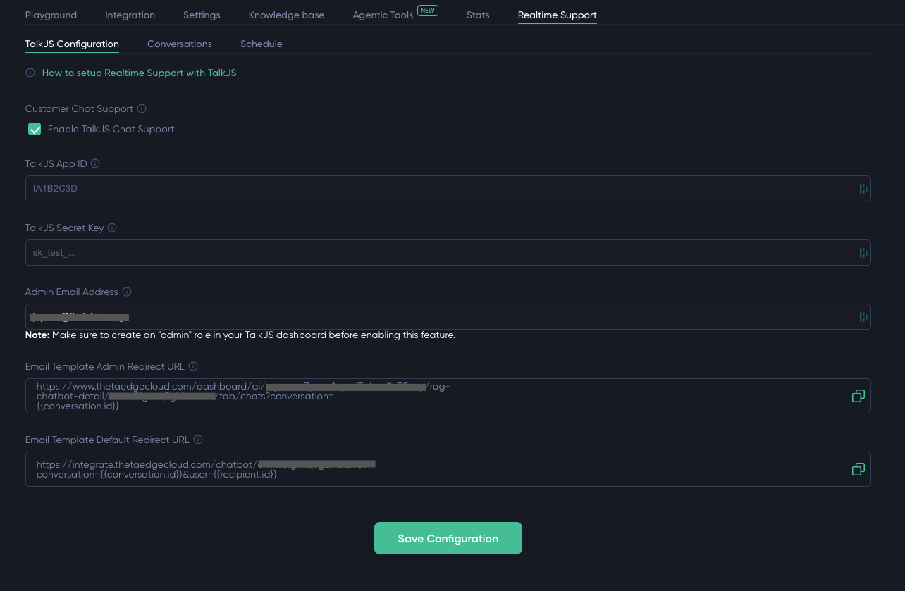 You can find the links for both the user and the admin, go back to the TEC dashboard, under Realtime Support -> TalkJS Configuration