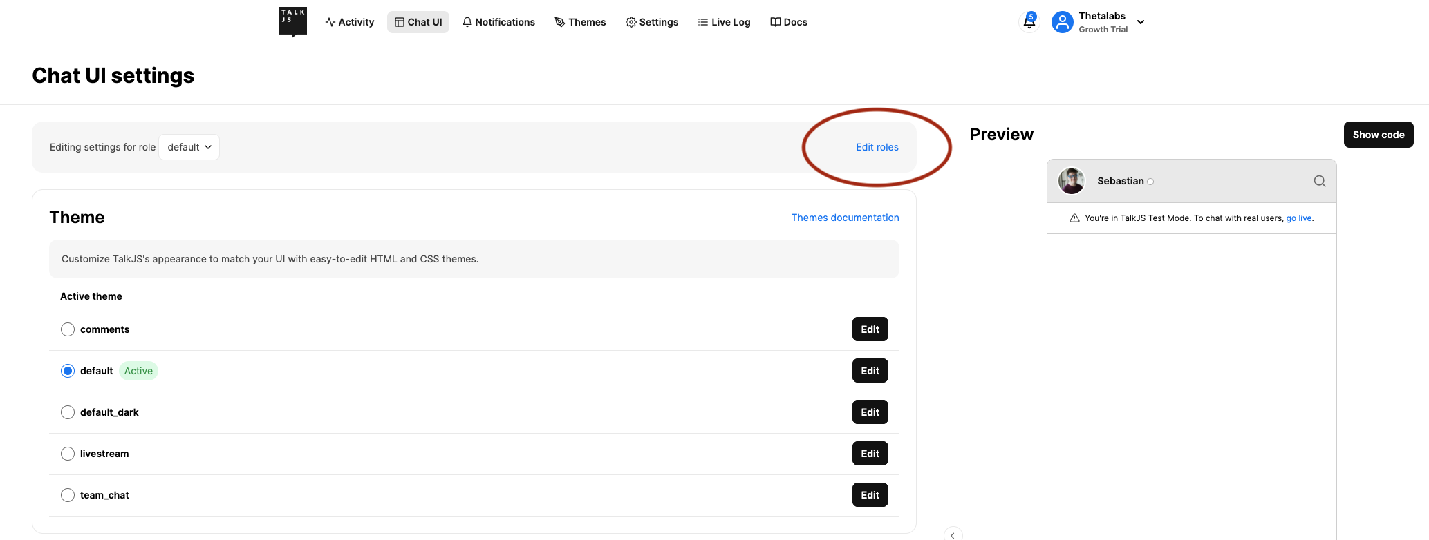 Create an "admin" role in the TalkJS dashboard by navigating to the Roles page. You can get here by clicking on Edit Roles in the Chat UI settings under the Chat UI tab.