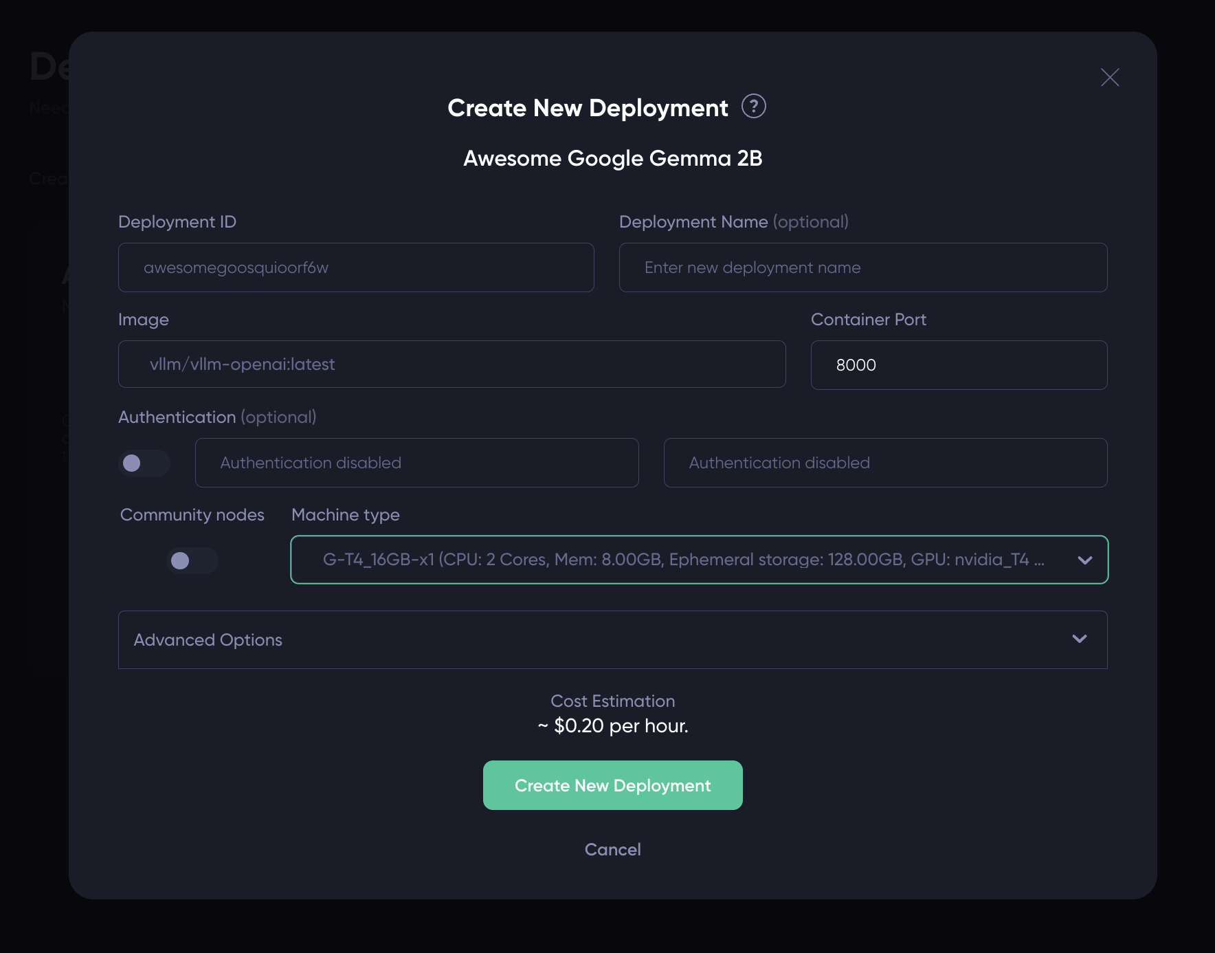 Container Image URL: Please fill in the URL of the container image for your workload. For example, if you want to host the latest vLLM image (https://hub.docker.com/r/vllm/vllm-openai), please fill invllm/vllm-openai:latest(the https://hub.docker.com/r prefix is not needed).Container Port: For example, if you run a web server inside the container at port 8000, please fill in 8000 for the field. It will be mapped to the 443 HTTPS port in the actual deployment. In the future, we may support multiple ports and port mapping.Container Argument: This field is optional. It is used to set the arguments you'd like to pass to the container. In the example shown in the screenshot below, we are trying to host the Google Gemma-2B model using vLLM. For this setup, we need to supply the container with argument["--model","google/gemma-2b","--dtype=half"].Container Environment Variables: This is also an optional field. It is used to set the environment variables to run the container with. In our example, Gemma 2B requires your HuggingFace access token, so we need to provide that with env variable{"HUGGING_FACE_HUB_TOKEN":"YOUR_HUGGING_FACE_ACCESS_TOKEN"}whereYOUR_HUGGING_FACE_ACCESS_TOKENcan be obtained following this guide. Note that many LLMs such as Llama, Gemma, and Mistral require you to sign a license agreement before using the model. You can find the license agreement on the model's HuggingFace model card page. For example, Gemma 2B's license agreement is available here.