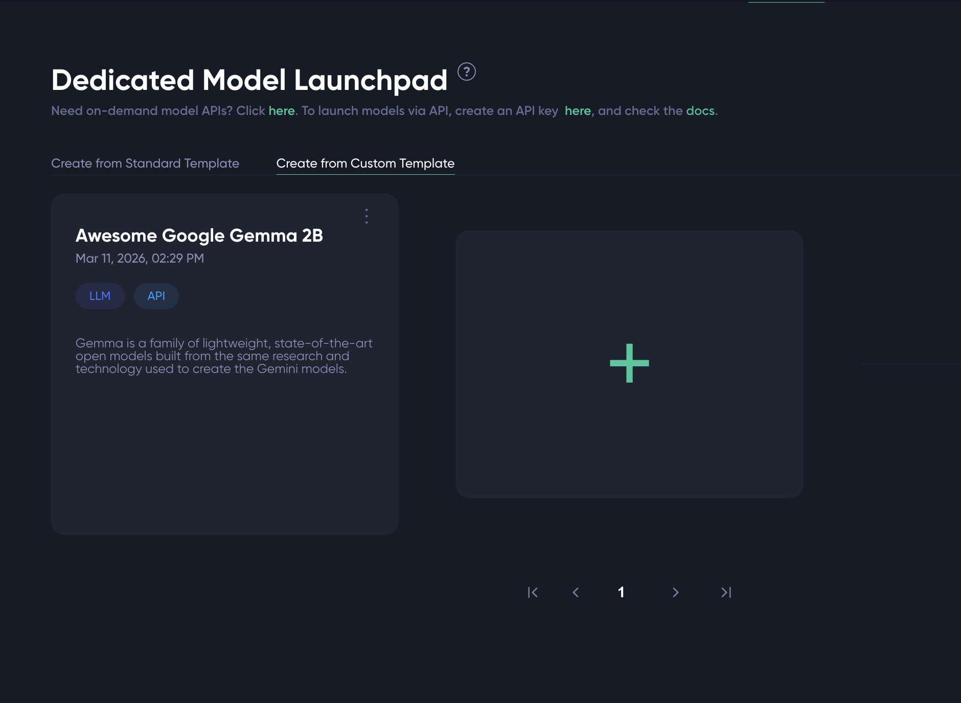 To run the workload in Theta EdgeCloud, first navigate to the Dedicated models page, which can be assessed by simply clicking on the "AI" icon on the left bar. On this page, click on "Create from Custom Template" tab as pointed by the red arrow (1) in the screenshot below. Next, click the "+" sign to a new custom template shown by arrow (2).